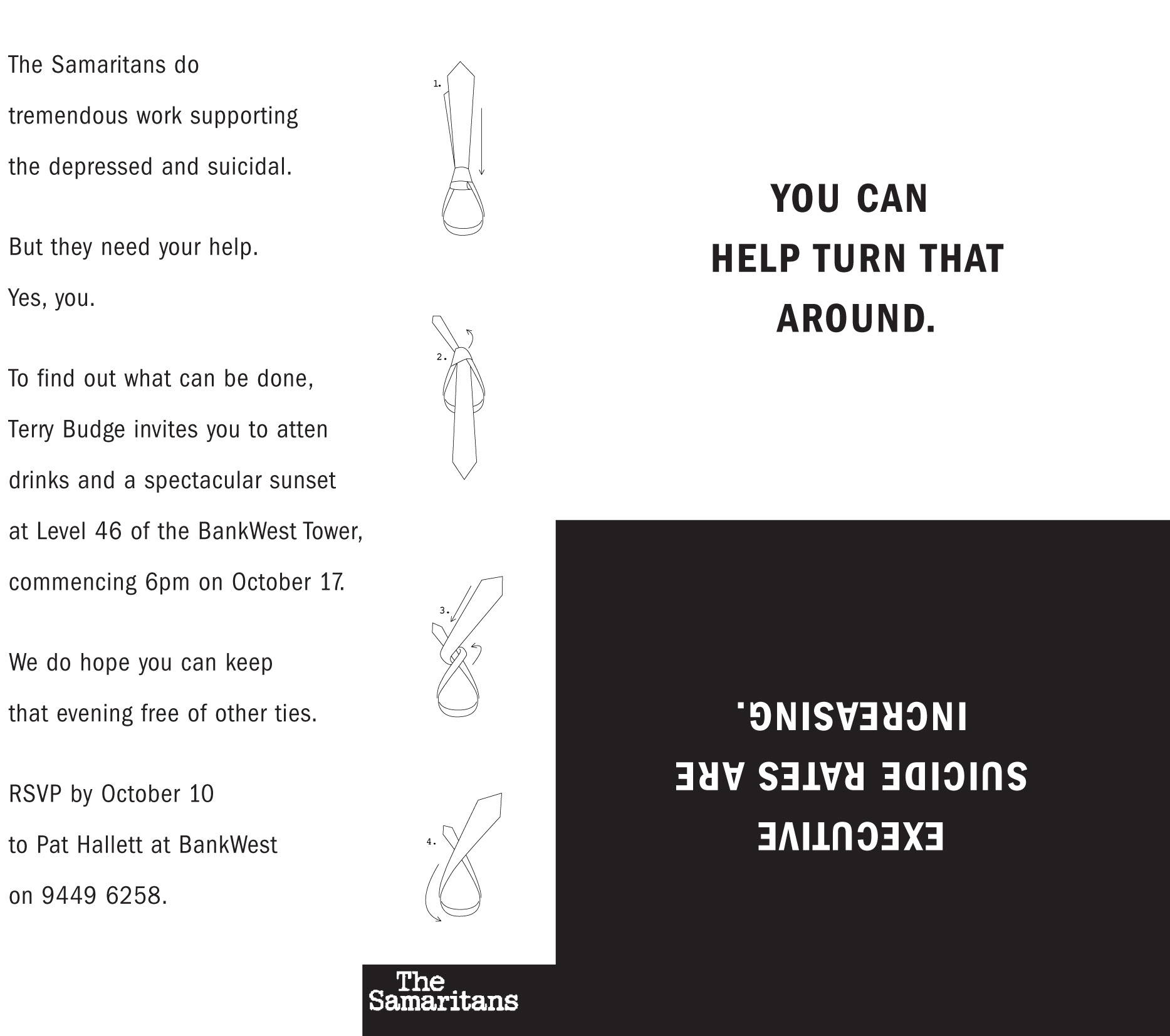 An invitation to an executive suicide awareness and fundraising evening for Samaritans, hosted by the Bankwest CEO. Won an AWARD Award for direct mail.